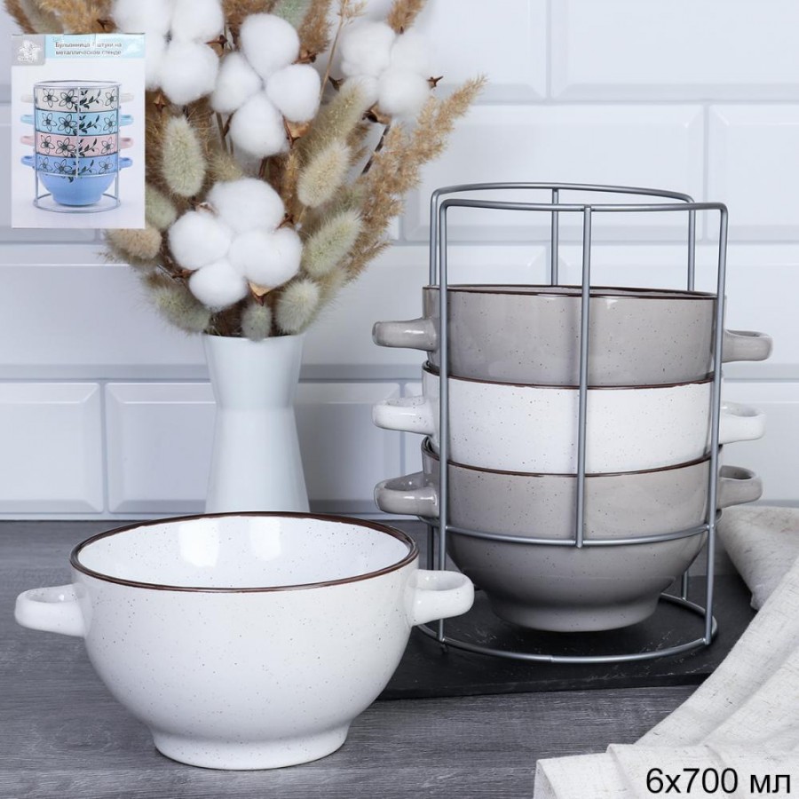 Бульонница с ручками 4штуки БЕЛО-СЕРЫЙ на подставке/ф/33579/ ГТ