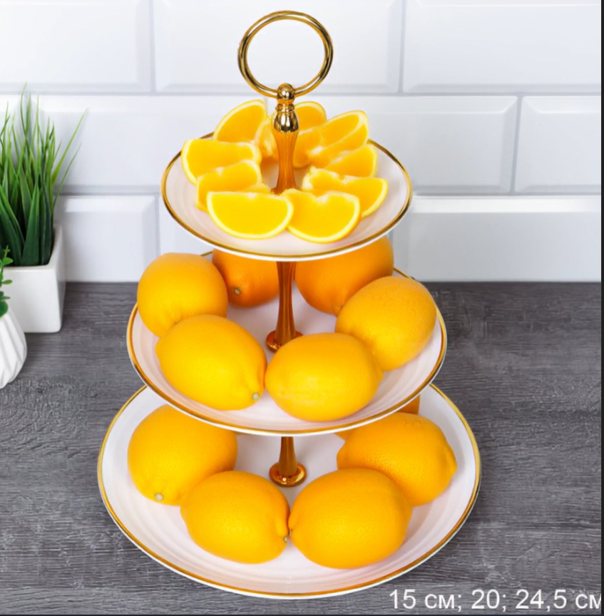 Фруктовница 3-х ярусная Круг белая золотой обод Пластик/D-1245/ф/ ГТ
